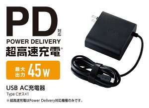 【送料無料】 ELECOM(エレコム) 45W Power Delivery ACアダプター ACDC-PD0145BKPower Delivery 超高速充電 USB AC充電器 USB-IF パワーデリバリー Typec 安心 安全 iphone スマートフォン スイッチ Nintendo Switch ケーブル 一体型 スイングプラグ 収納