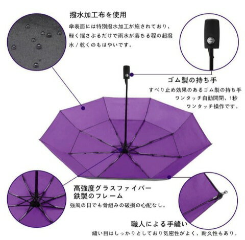 ) 【本体サイズ】・傘展開時:弧長118cm・直径:101cm・折り畳む長さ:30cm・傘の重さ:約400g・骨の数:8本骨 【素材】・生地:210Tポンジー生地・持ち手:人間工学に基づいた握りすいグリップ、滑り止めの施されたゴム加工ホルダー・フレーム(骨組み):ガラスファイバー、鉄製フレーム 【ご注意】・開閉は自動式ですが、1秒ワタッチ操作です。