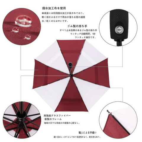 ) 【本体サイズ】・傘展開時:弧長118cm・直径:101cm・折り畳む長さ:30cm・傘の重さ:約400g・骨の数:8本骨 【素材】・生地:210Tポンジー生地・持ち手:人間工学に基づいた握りすいグリップ、滑り止めの施されたゴム加工ホルダー・フレーム(骨組み):ガラスファイバー、鉄製フレーム 【ご注意】・開閉は自動式ですが、1秒ワタッチ操作です。