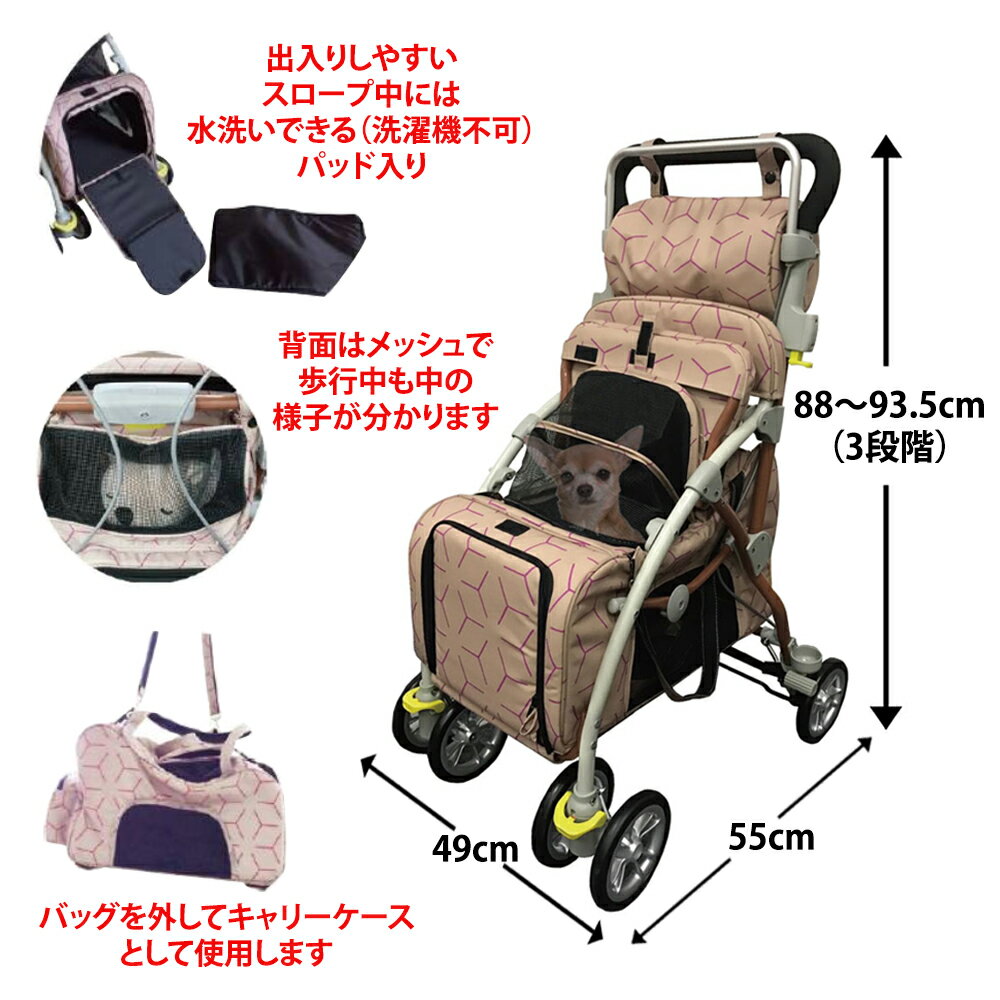 ◆商品詳細 商品説明 サイズ 幅49cm×奥行55cm×高さ88〜93.5cm(3段階) フレーム アルミ 重 量 5.5kg 耐荷重 80kg バッグ容量 約40L 車輪径 14cm 座幅 32cm 座奥行 22.5cm ※注意点利用できるペット条件は体重5kg以下、一匹まで。