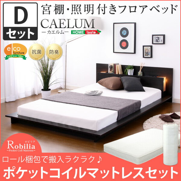 【送料無料】宮、照明、コンセント付きフロアベッド【カエルム-CAELUM-(ダブル)】(ロール梱包のポケットコイルスプリングマットレス付き)【北海道・沖縄・離島配送不可】
