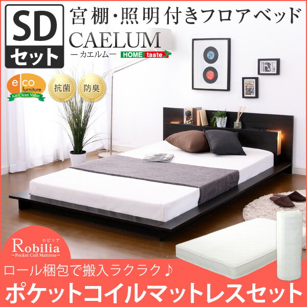 フロアベッド ローベッド 照明 宮棚 コンセント付き ヘッドボード ロータイプ 木製 すのこ 北欧 デザインベッド 【カエルム-CAELUM-セミダブル】ロール梱包のポケットコイルスプリングマットレス付き【OG】